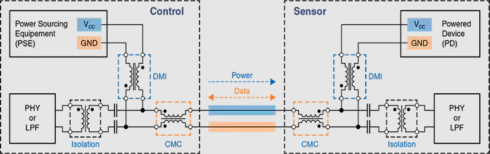 10Base-T1L SPoE를 구현하려면 최소한 공통 모드 초크(CMC)를 사용해야 하지만 애플리케이션에 따라 차동 모드 인덕터(DMI) 및 갈바닉 절연 변압기도 필요할 수 있습니다. 애플리케이션에서 제어 트랜시버와 최종 디바이스 간의 데이터 전송만 필요한 경우, 연선 케이블과 PHY/LPF 컨트롤러 사이에 CMC가 필요합니다. 동일한 연선 케이블로 전력과 데이터를 전송해야 하는 경우, 전원 장비(power source equipment, PSE: VCC 및 GND 단일 종단선)를 연선 케이블에 브리징하기 위해 DMI도 필요하며, 이는 CMC 전에 수행하는 것이 가장 좋습니다. 마지막으로, 안전상의 중대한 이슈가 있을 수 있다면 갈바닉 절연이 필요한 경우가 많습니다. 이를 위해 제어 및 최종 디바이스 하드웨어 모두에 대해 PHY/LPF와 다운스트림 회로 사이에 추가적인 절연 변압기가 필요합니다.