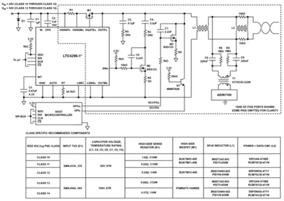 그림 2. 다양한 전력 레벨을 위한 권장 SPoE 인덕터 및 전력 + 데이터 공통 모드 초크(CMC)를 갖춘 LTC4296-1 802.3cg Class 10 ~ 14 레퍼런스 디자인 (출처: 아나로그디바이스(Analog Devices))