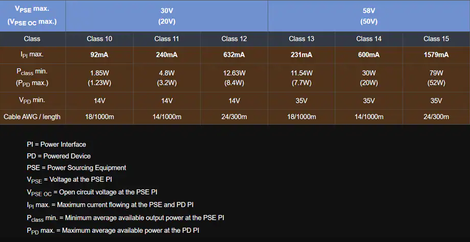 PoDL은 원래 자동차 및 이와 유사한 애플리케이션에 최적화된 것이며, 일반적인 이더넷 애플리케이션에는 PoE(Power over Ethernet)가 사용되었습니다. IEEE 802.3의 104항에 따라 PoDL은 주로 빌딩 자동화 및 산업용 네트워킹 시스템을 위해 SPoE 전력 등급 10~15를 사용하는 10Base-T1S/T1L로 확장되었습니다. SPoE 전력 등급은 IIoT 네트워크와 같은 운영 기술(OT) 네트워크용으로 정의됩니다. SPoE는 각각 20, 24 또는 30VDC를 사용하는 장, 중, 단 케이블에 대해 Class 10, 11, 12를 정의했습니다. Class 13, 14 및 15는 각각 50, 55 및 58VDC를 사용하는 장, 중, 단 케이블에 대해서도 정의되어 있습니다. SPoE는 PoDL처럼 규제 또는 비규제 등급이 없으므로 1.23W ~ 52W의 전력을 공급할 수 있습니다(표 1).