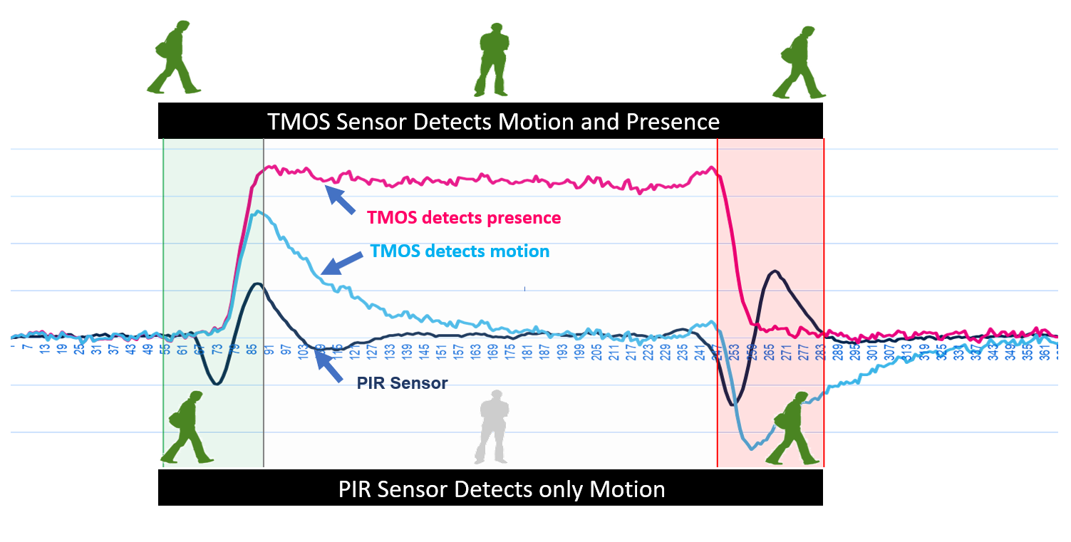 TMOS 센서는 모션과 존재라는 두 가지 내부 알고리즘 또는 플래그를 제공합니다. 모션 플래그는 PIR 센서와 마찬가지로 FoV에 들어오고 나가는 사람을 감지합니다. 그러나 존재 플래그는 사람이 FoV에 남아 있는지를 감지합니다. 사람이 FoV 내에 있는 한 TMOS는 사람의 존재를 감지하고 출력 신호를 떨어뜨리지 않습니다.